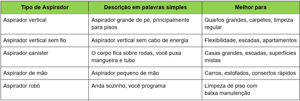 Aqui está uma tabela simples para mostrar os diferentes tipos de aspiradores, para que você possa ver onde um aspirador vertical sem fio pode ajudar você..